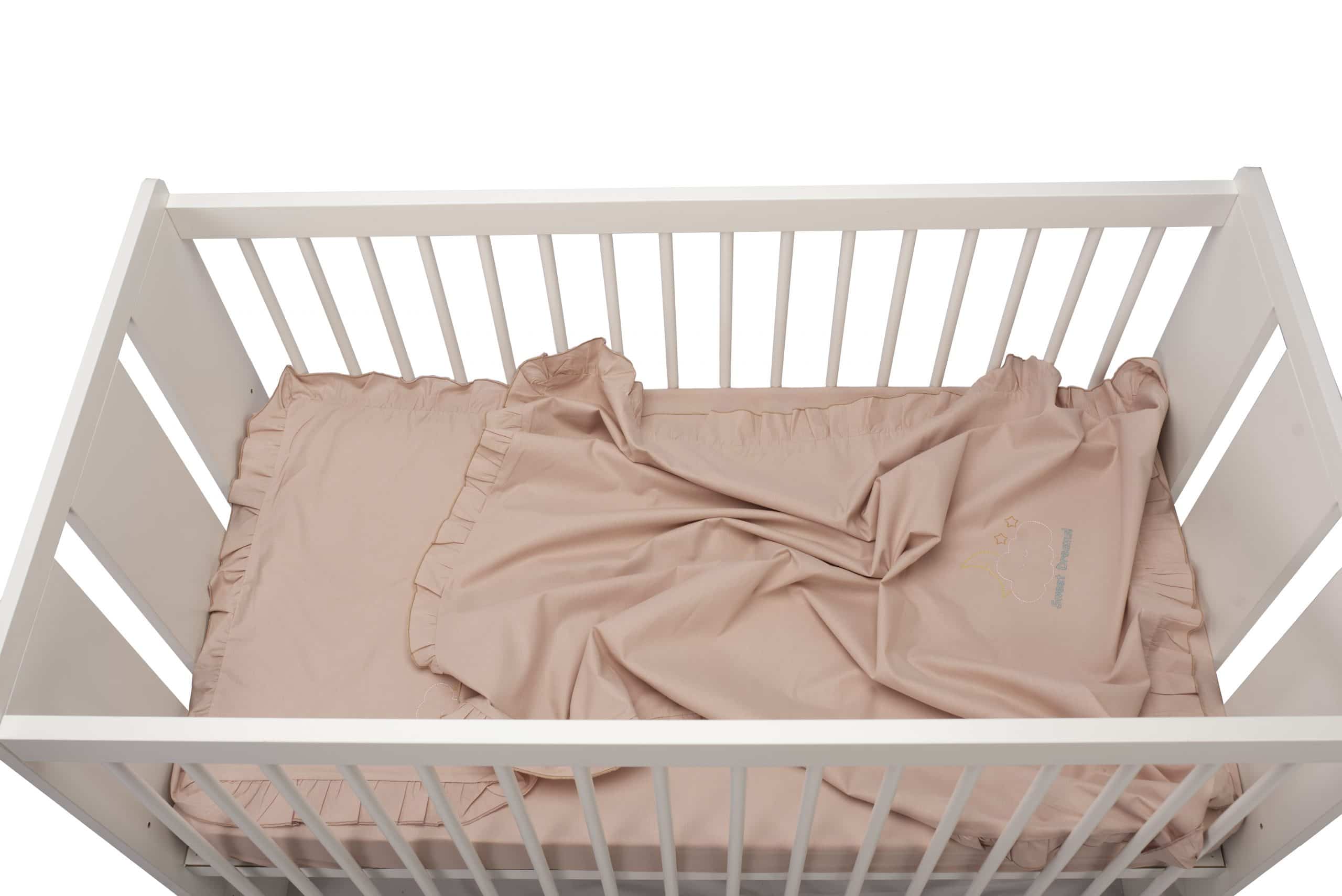Set lenjerie patut bebe, bumbac (cearceaf pat 70×140, cearceaf pilota 100×140, fața perna 35×50), brodata, cu volan, ROZ