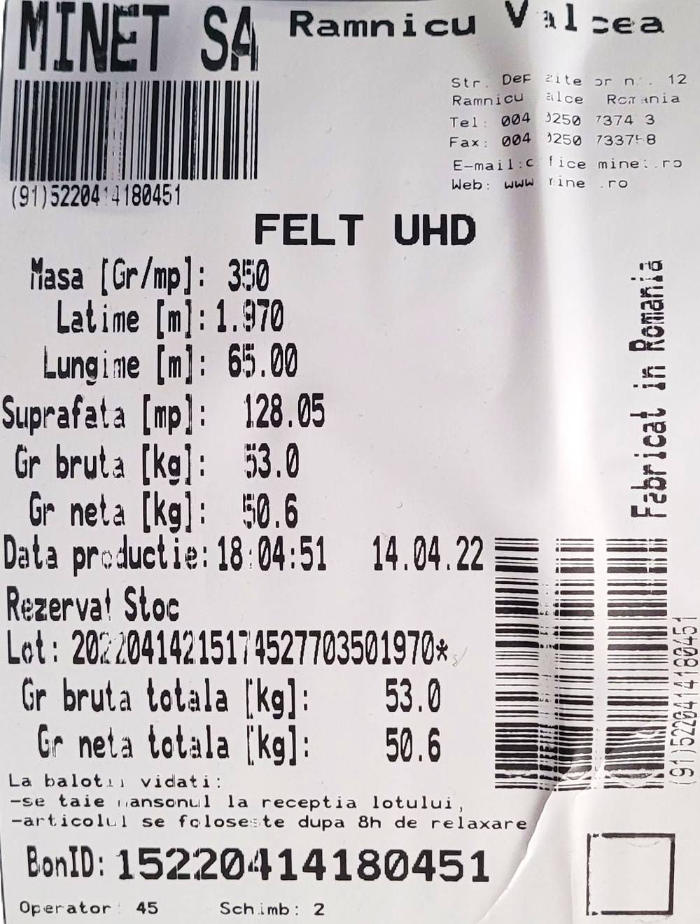 - greutate neta rola: 45.5 Kg (±10%)